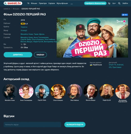 Національний онлайн-кінотеатр SWEET.TV презентує ексклюзивну прем’єру української стрічки «DZIDZIO ПЕРШИЙ РАЗ» виробництва кінокомпанії DZIDZIOFILM. З 1 лютого фільм доступний всім абонентам сервісу безкоштовно в межах підписки.